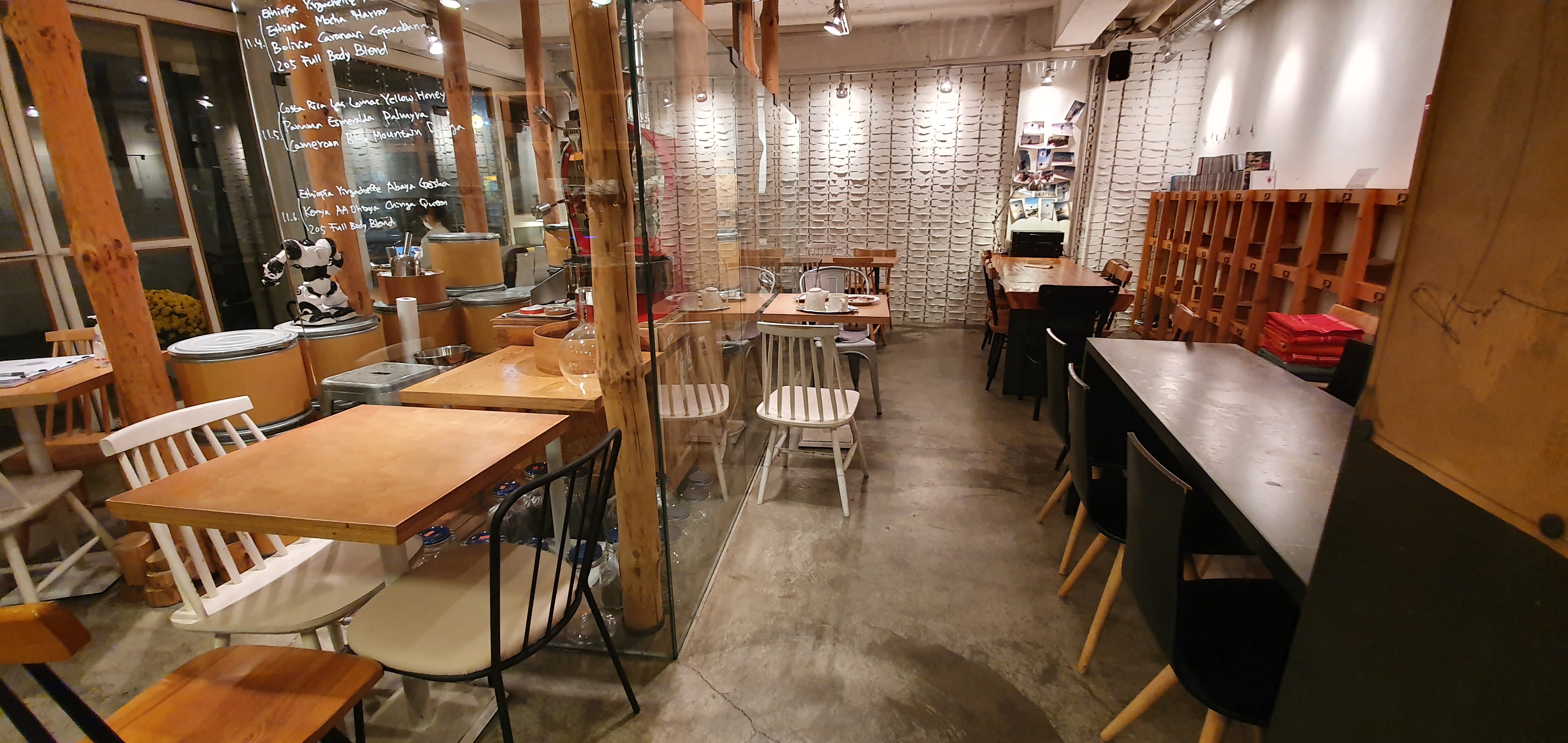 이 테이블이 단체석이고 9명 정도 앉을 수 있는 공간입니다. 벽 책장에는 노트가 여러 권 놓여있는데 이공오도씨 노트예요. 사장님께 문의하시면 구매하실 수 있습니다. 옆 책장에는 사장님께서 세계여행 다니셨던 앨범도 있고 구경할 수 있어서 은근히 재미있어요.ㅎㅎ