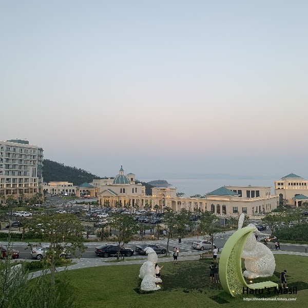 이렇게 곳곳에 건축물이나 동상들이 있어서 사진 찍기 좋은 진도 쏠비치 리조트 입니다. 곳곳에 벤치들도 마련되어 있어서 산책하다가 앉아서 쉬셔도 되고, 빵집과 로봇카페도 있기 때문에 빵도 드시고 카페도 가실 수 있어요. 로봇카페는 로봇이 커피를 내려주는 카페인데, 신기하지만 커피맛은 별로 였어요...