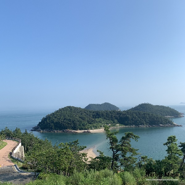 진도 쏠비치 리조트 산책로를 걷다보면 저렇게 섬이 보입니다. 저 섬이 신비의 섬이라고 하시더라구요. 바로 리조트와 저 섬 사이의 길이 바닷물이 빠지면 열리더라구요. 사진 속에서도 살짝 길이 보이시죠? 신비의 섬을 가던 길이 매우 이뻐서 기분이 참 좋았어요. 사람이 없어서 더 좋았습니다.