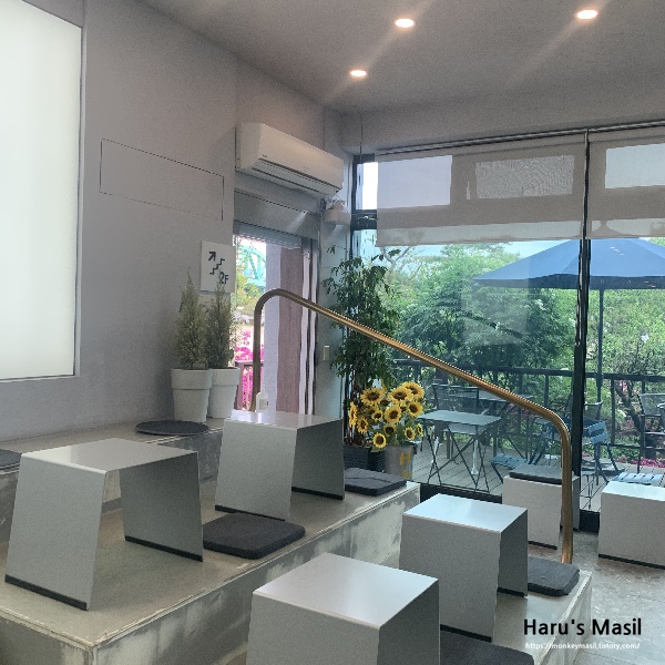베이커리 씨어터는 이런 분위기의 카페 였고 야외 좌석 부터 4층까지 좌석이 있어서 어디 앉을지 한참을 고민했습니다. 야외 좌석은 대부분 꽉 차있었고, 창가에 앉고 싶은데 창문이 조금 더러워서 살짝 꺼려졌습니다만 그래도 창가좌석에 자리를 잡았습니다.