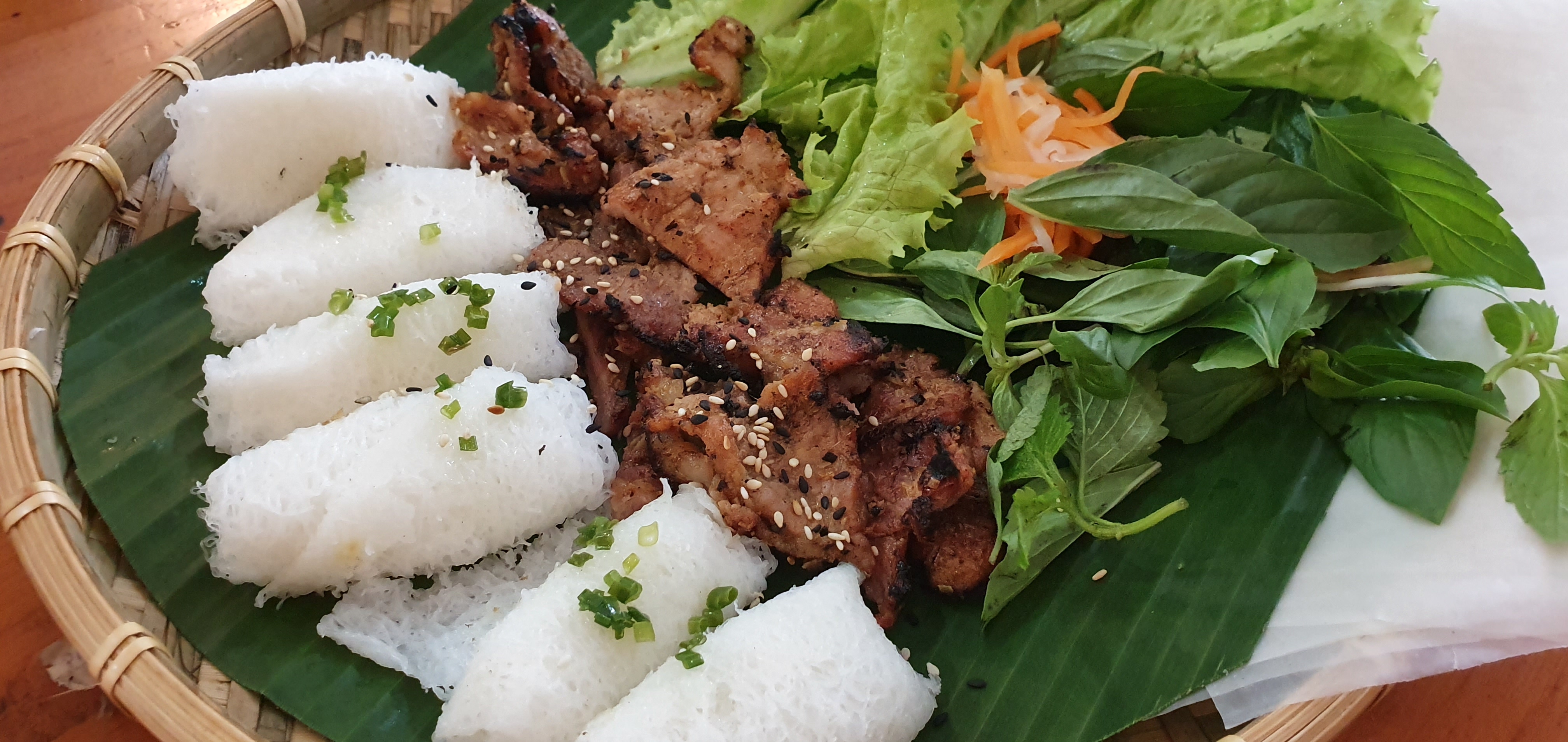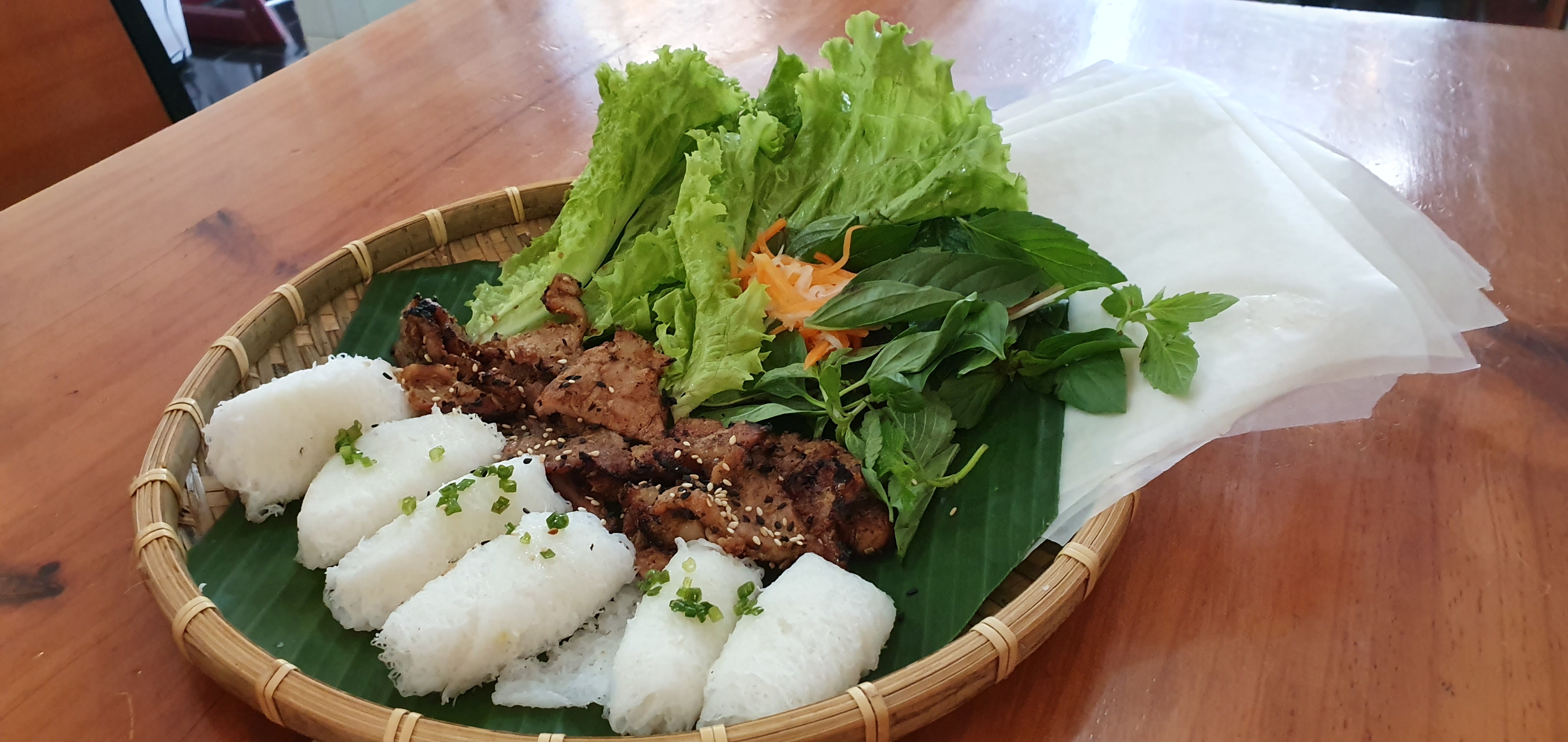 지금은 이 메뉴의 이름이 전혀 기억이 나지 않는데, 하얗고 얇은 라이스페이퍼가 보이시나요? 손으로 돌돌 열어서 손바닥에 펼친 뒤게 고기와 야채를 넣고 돌돌 싸서 먹는 음식입니다. 제가 먹는 법을 몰라 손들고 여쭤봤더니 직접 와서 싸주셨어요.
