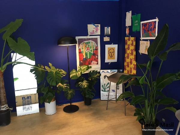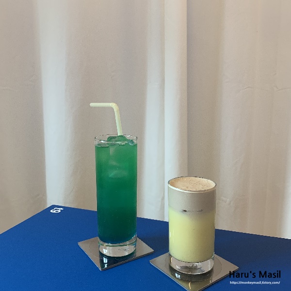 신기한 메뉴들이 많아서 고민을 한참 하다가 주문을 마쳤어요. 서울테이블 플래트에 사람이 없는 관계로 편하게 사진을 찍으며 돌아다닐 수 있었습니다. 블루 계열에 인테리어에 초록색 식물들이 더해지니 더 푸릇푸릇한 느낌이 많이 들어서 신기했어요. 기존 서울테이블 카페와는 많이 다른 느낌이 들어서 연관된 카페라고 생각이 들지 않을 정도 였어요.