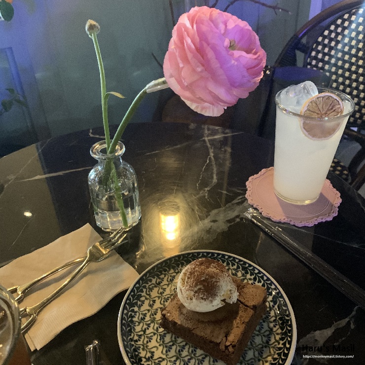 주문하고 나온 메뉴들. 친구가 레몬에이드가 달까봐 걱정스러워서 시럽이 들어가냐고 물어봤는데 시럽은 안들어간대요! 그럼에도 달았던 걸 보면 아마 탄산수가 아닌 사이다를 사용하시는게 아닌가 싶어요. 브라우니는 참 맛있었어요!