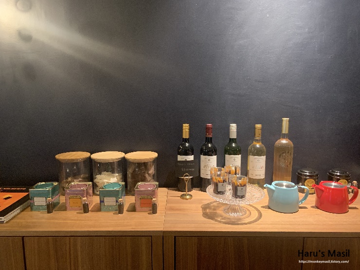 주문을 하고 내부를 둘러봤어요. 한 켠에 보이는 맥주와 와인들. 민트색과 적절히 어울려진 인테리어는 참 파리 생각나도록 잘 해두셨더라구요.