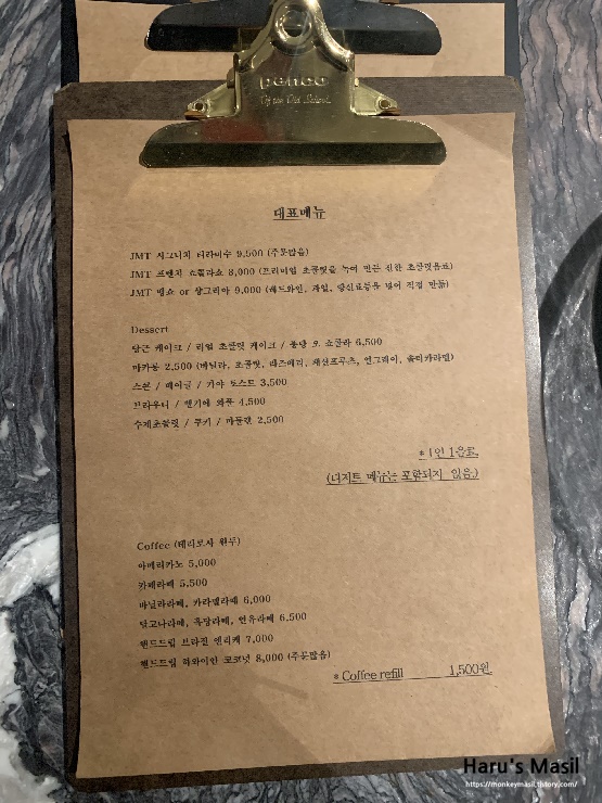 커피메뉴는 이렇게 되어 있고 와인이나 맥주는 다음 장에 있었는데 저희는 커피마시러 온거라 ㅎㅎ 다음장을 넘겨보지 않았네요. 저희는 브라우니 4,500원, 아이스 아메리카노 5,000원, 레몬에이드 5,000원 이였어요.
