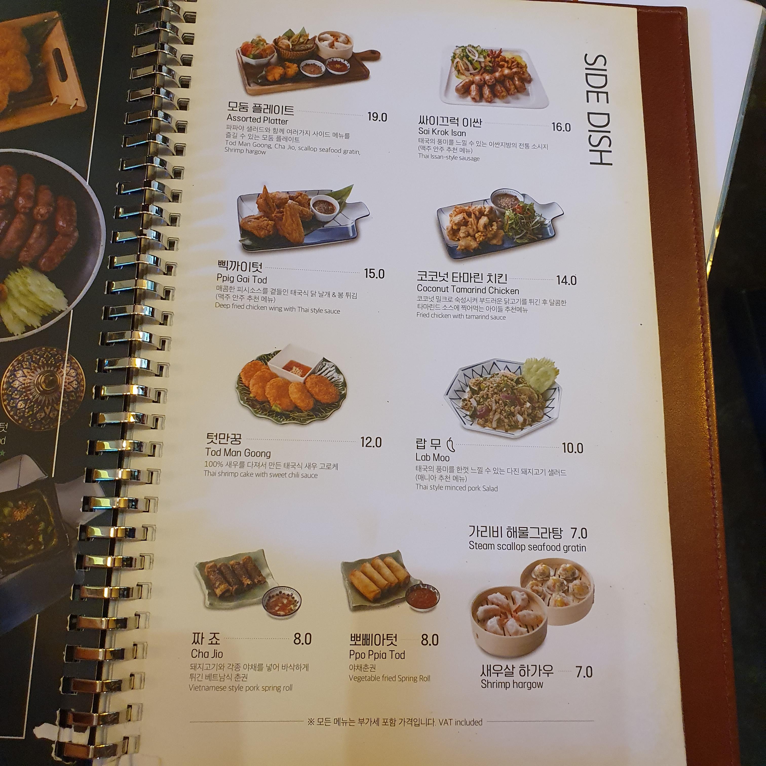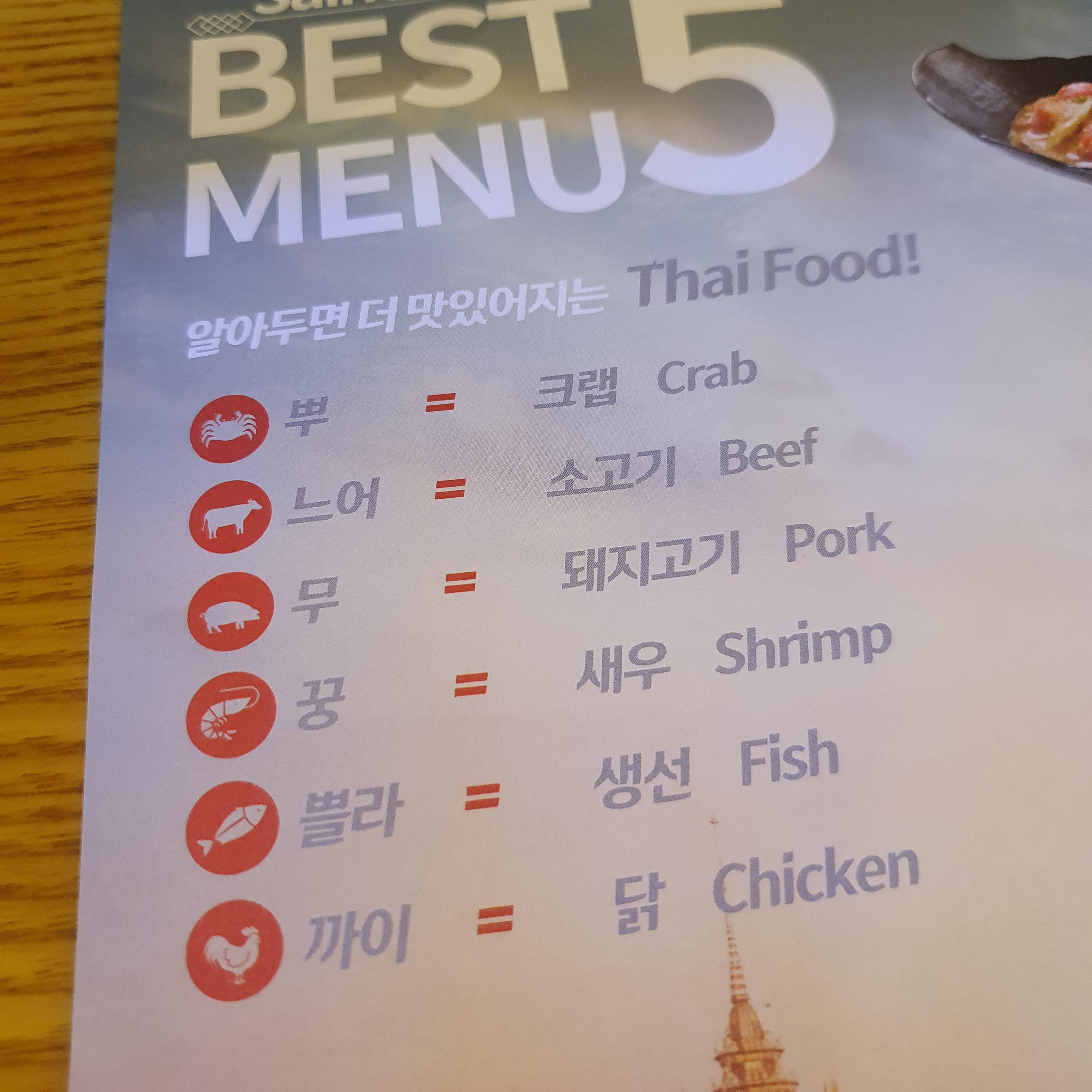 테이블 종이보에 간단한 타이 음식 단어들이 있네요. 사실 태국 갔을 때, 이 정도는 영어로 말해도 소통이 다 돼요. 그런데, 관광지가 아닌 곳에서는 사진도 영어도 안돼서 글자로만 써졌을 경우에는 큰 도움이 될 것 같네요. 적어도 내가 뭐가 들어간 걸 시키는지 알 수 있을 거예요. 코로나 이후 태국 여행을 위해 미리 암기합니다.