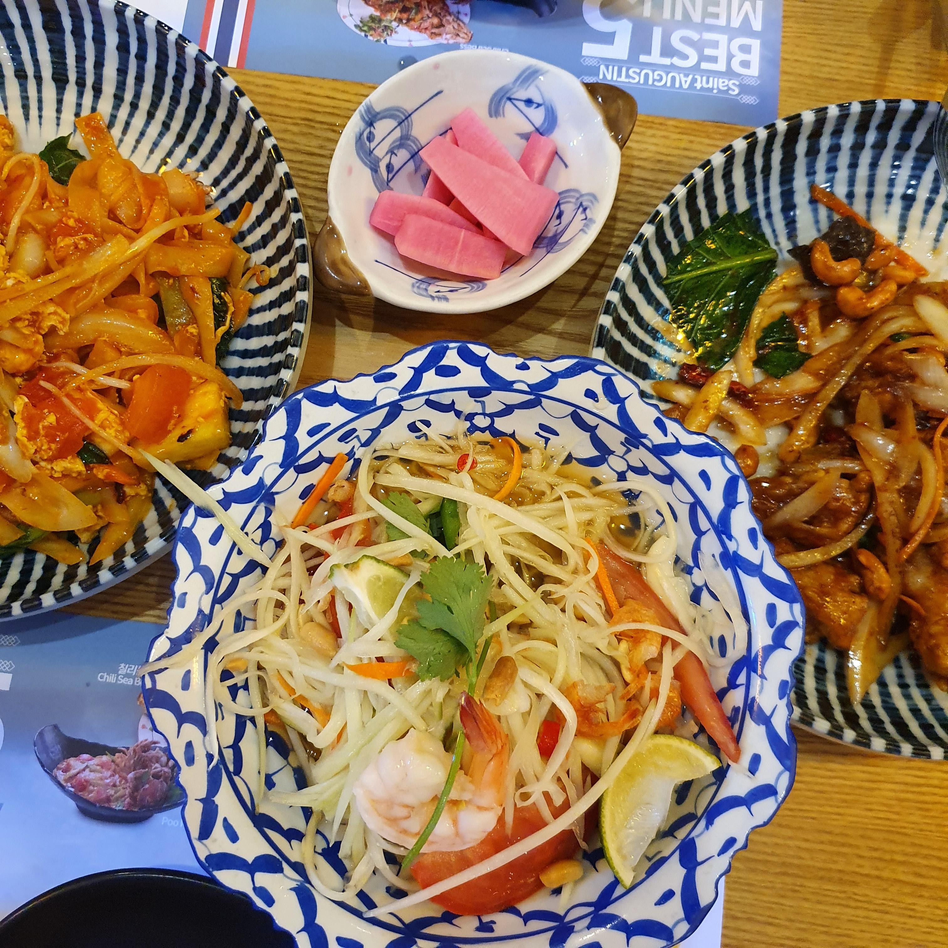 팟타이랑은 다르게 새콤한 맛이 더 나서 팟타이 누들 같은 고소한 맛을 기대하셨다면 실망하실 수도 있어요. 정말 새콤새콤한 누들이라서 맛은 있는데 세 메뉴 중에서는 꼴등이에요. 생어거스틴누들보다는 팟타이나 다른 면 종류가 더 고소하게 맛있으니 참고하세요.