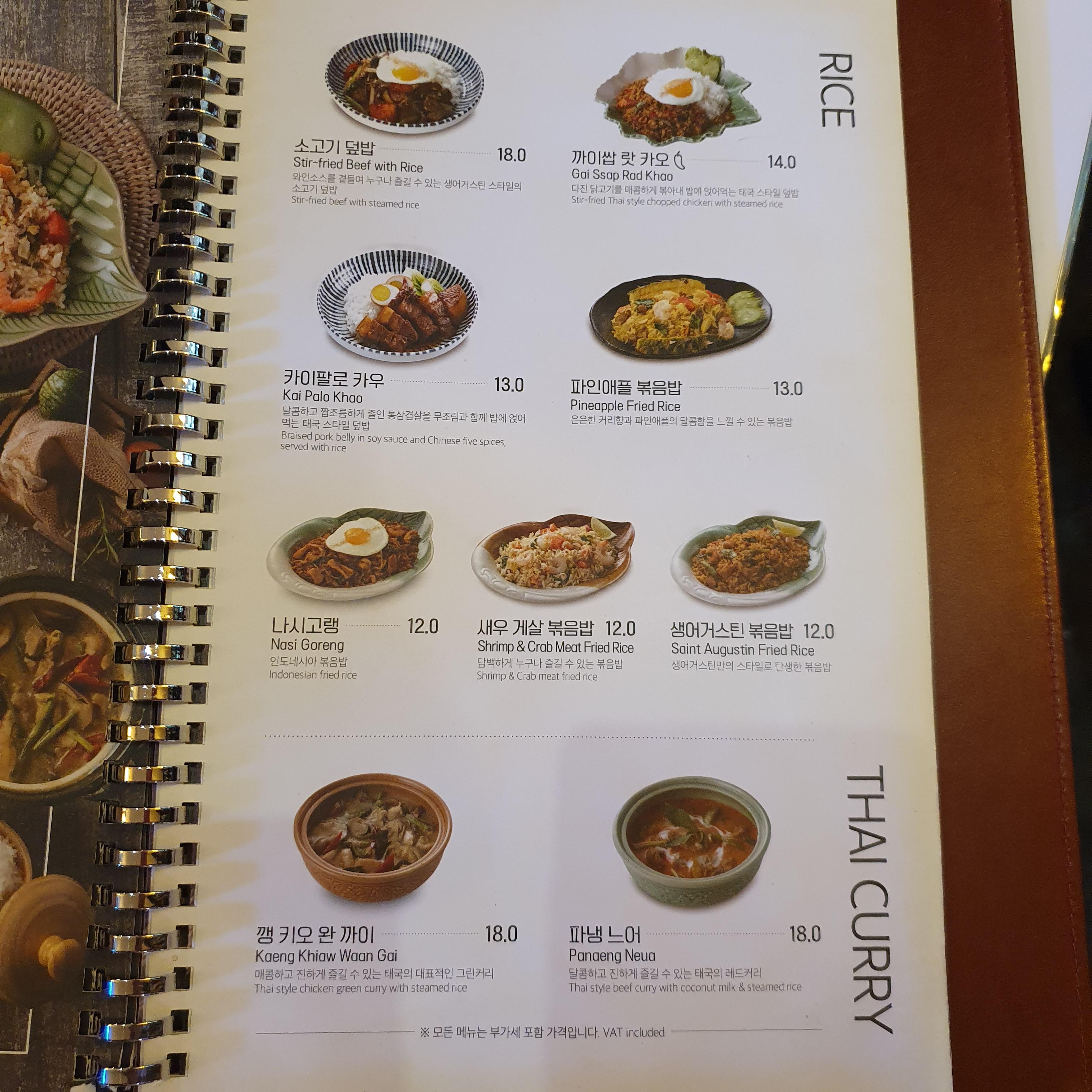 생어거스틴은 모든 메뉴들이 대체로 만족스럽고 태국 현지 맛과 비슷하다. 한국적 입맛이라면 기본 유명 메뉴로 가고 이것저것 입맛에 맞게 도전해봐도 좋을 식당이고 음식이다. 부모님도 좋아하실 맛.