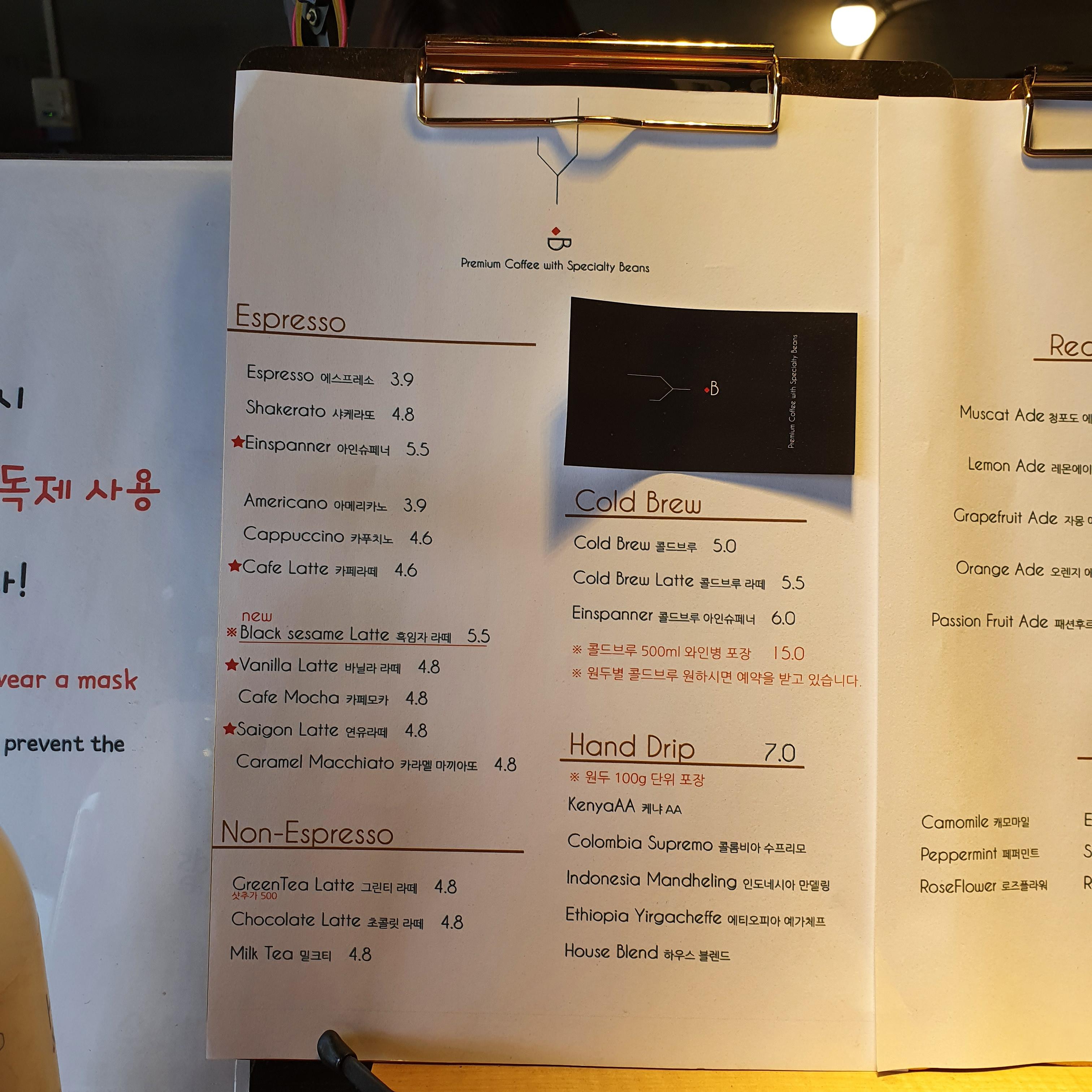 에스프레소와 콜드브루, 핸드드립이 주 메뉴인데 제가 카페인을 못 먹어서 선택권이 많지는 않았습니다. 제 친구가 이 집 단골이라는데 저도 커피 맛을 꼭 맛보고 싶네요. 메뉴에 별 표시가 있어서 메뉴 고르기가 한결 쉬울 것 같습니다.