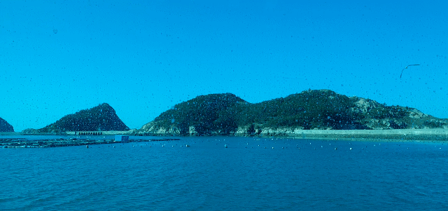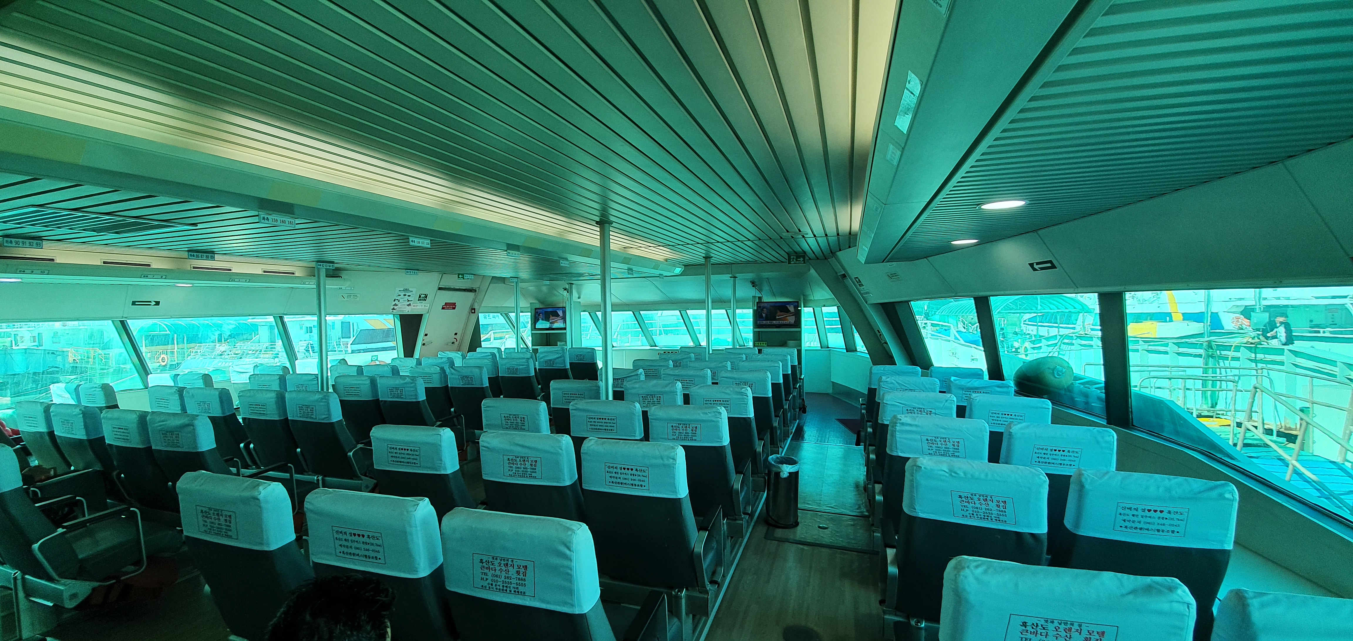 배를 탔는데 밖에서 구경할 수 있는 시스템이 아니라 배 실내에서만 파란 유리창 안에서 가만히 앉아 2시간 30분을 앉아가게 돼요. 배 밖에서 구경할 수 없는 이유는 파도가 거친 바다를 지나기 때문에 좌석에만 앉아 있어야 하고 파도가 센 구간에서는 모두 자리에 앉기를 선원들이 반복적으로 꼭 앉아있기를 안내할 정도.