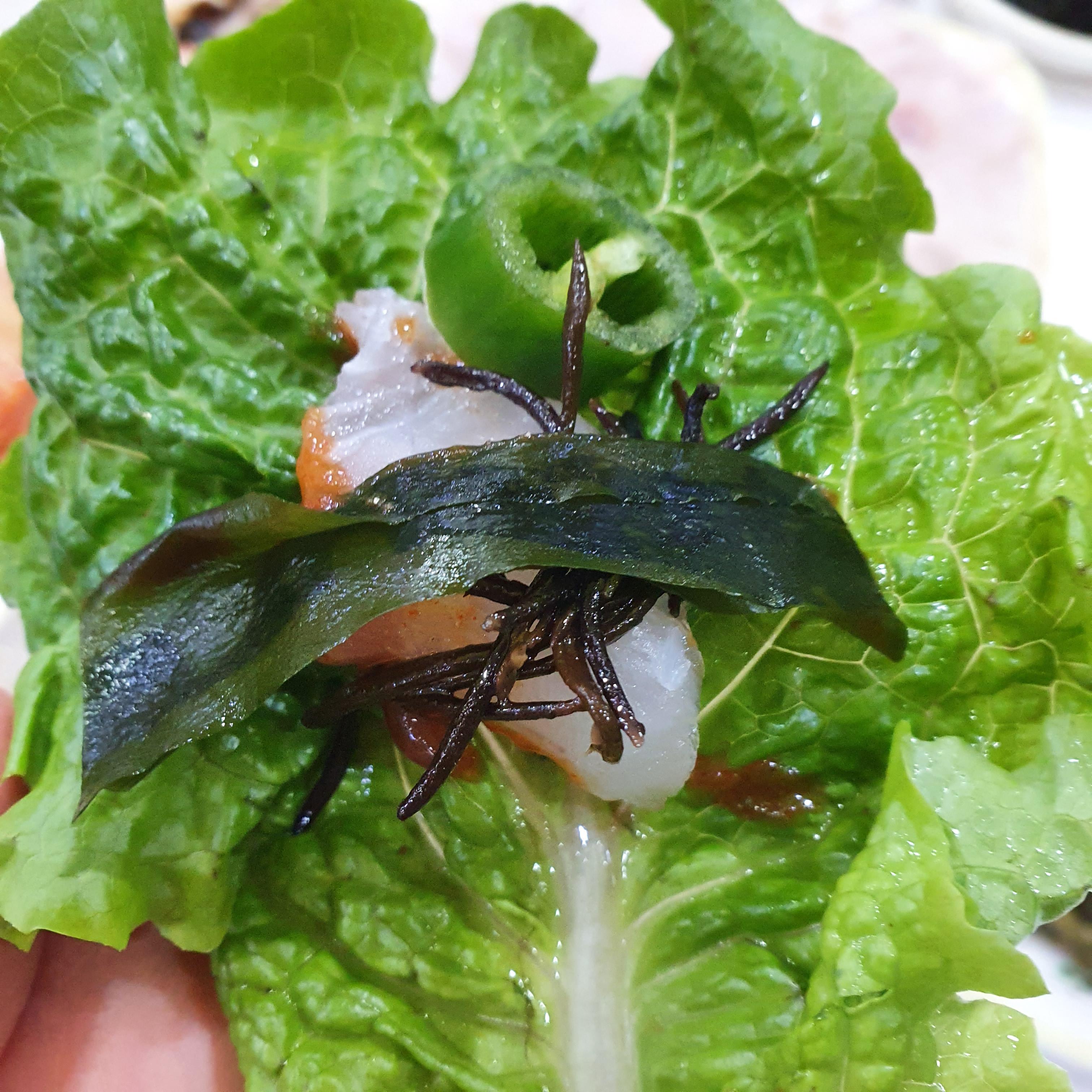 서해 호텔 석식의 고추는 많이 맵지 않아서 쌈에 우럭과 고추를 함께 싸 먹으면 정말 매력적. 회 먹으면서 뿔소라도 한 번 먹어주고 문어도 먹어주다가 한 마디 대화도 없이 식사만 하고 있는 모습을 발견.