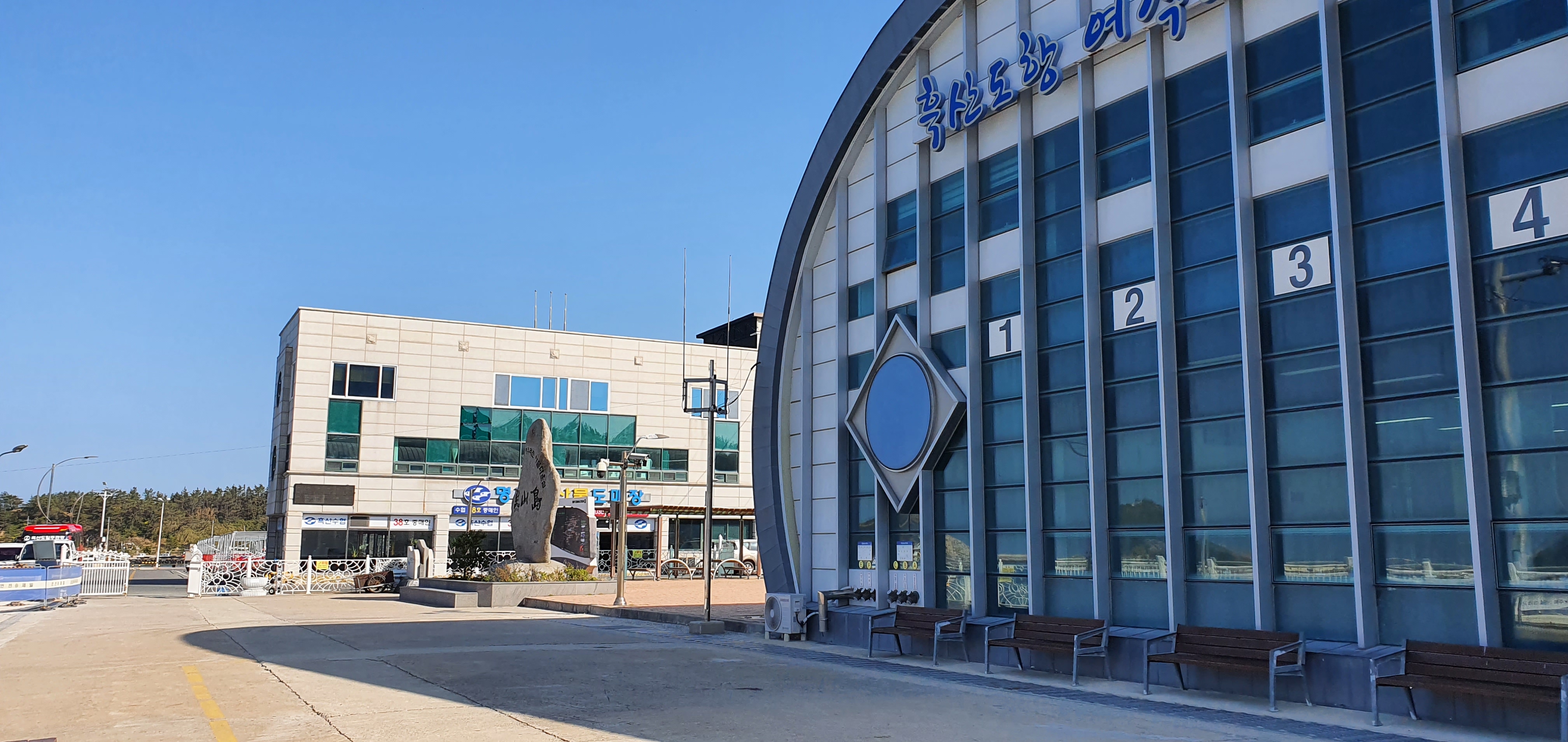 내리자마자 고래 모양의 흑산도항 여객터미널이 보이는데, 무지개 여행사의 경우 왼쪽 명일 수산 건물로 가서 짐을 맡긴 뒤 버스 여행을 하는 순서입니다.