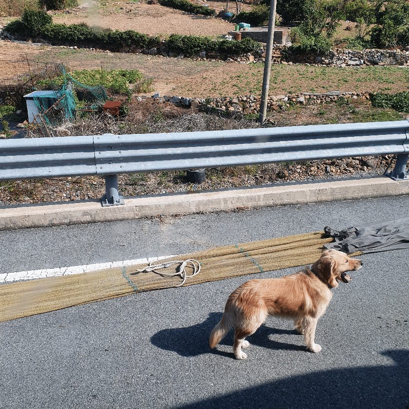 지나가다 도로 가장자리에서 멸치 그물을 정리하고 계시는 분을 만났습니다. 바로 옆에 앉아 웃고 있는 강아지 한 마리가 너무 시선을 강타하네요.