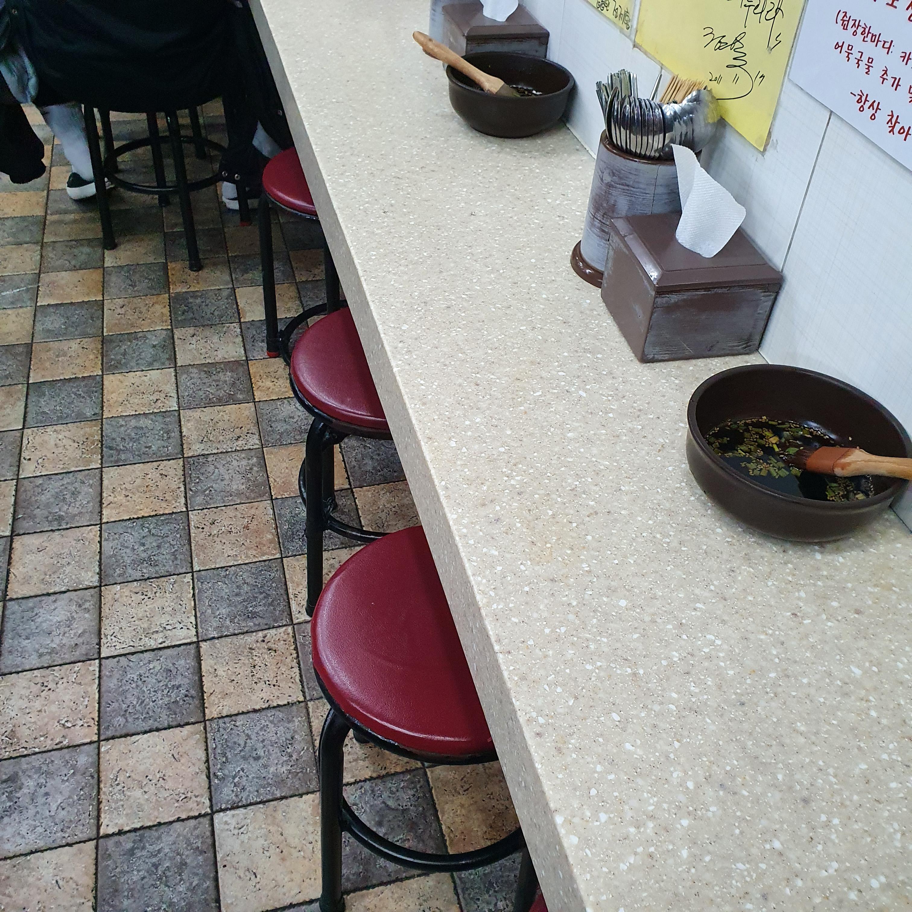 홀은 이렇게 원형 테이블과 바형 테이블 두 종류인데 자리를 비우지 않고 가득 채워 앉아야 하고 원형 테이블은 분식집 느낌으로 모르는 사람들과 얼굴 마주 보고 먹으면 됩니다.